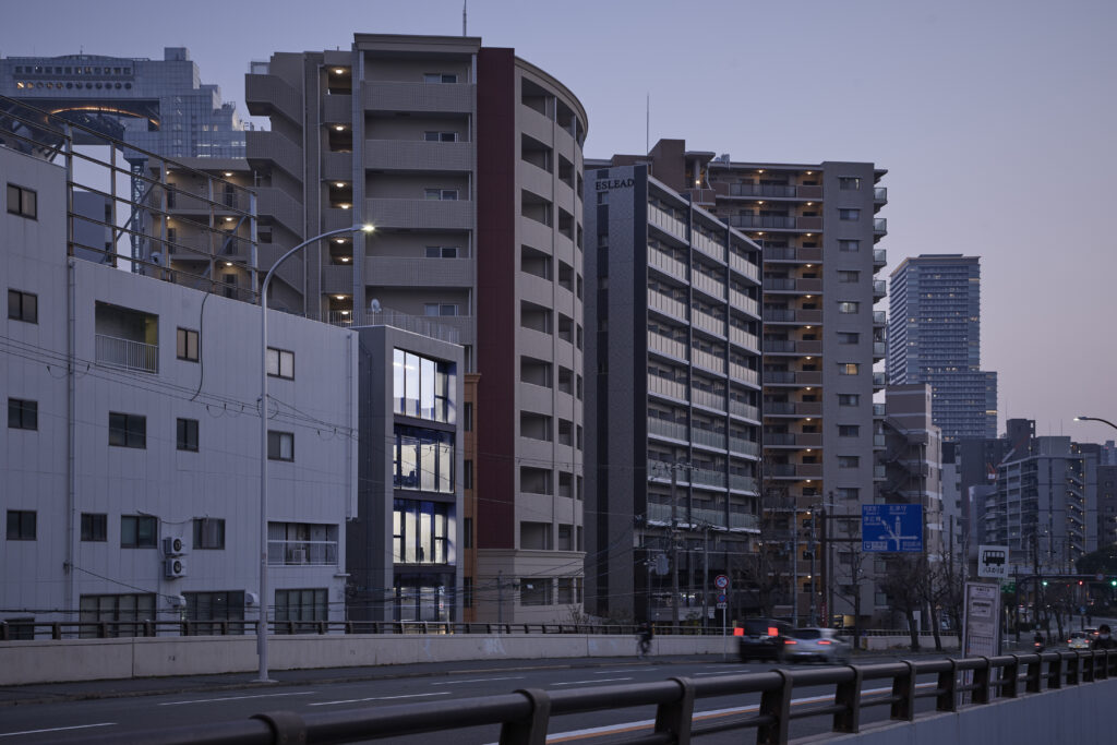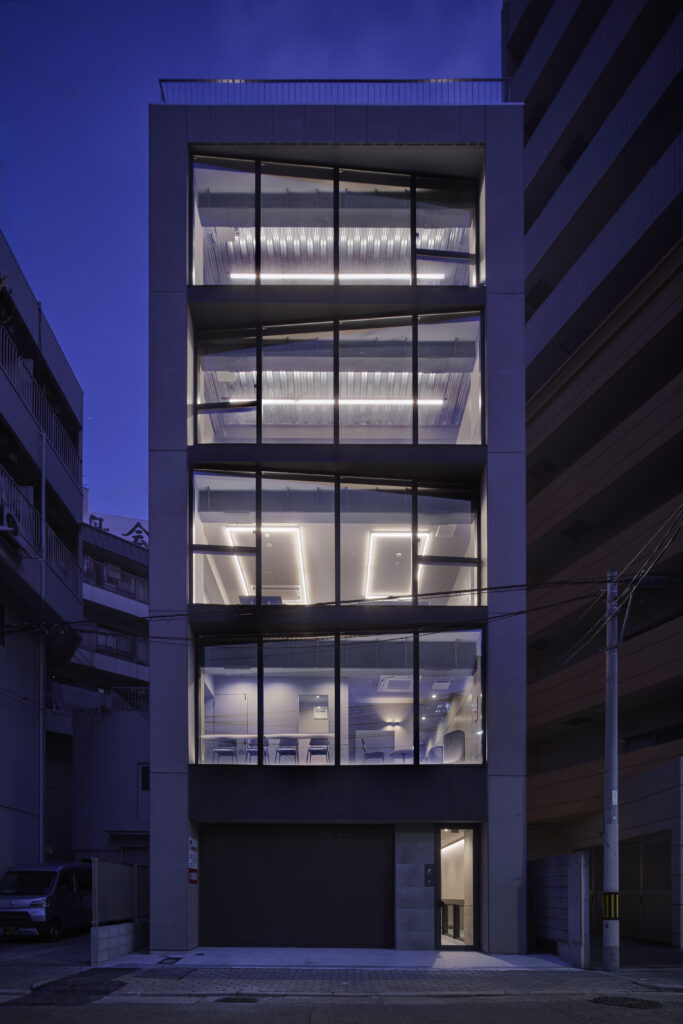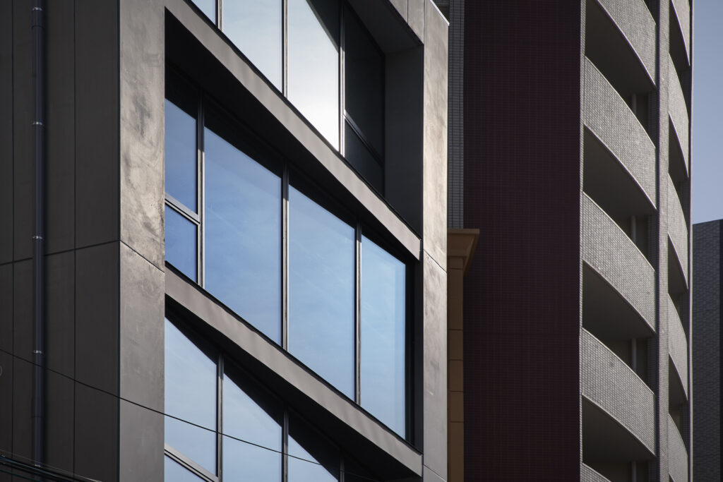 外観デザインの大きな特徴は、階ごとに角度を変えた窓のラインです。これにより、建物全体に独特の躍動感が生まれるとともに、室内のプライバシーを保ちつつ、豊かな採光を確保しています。