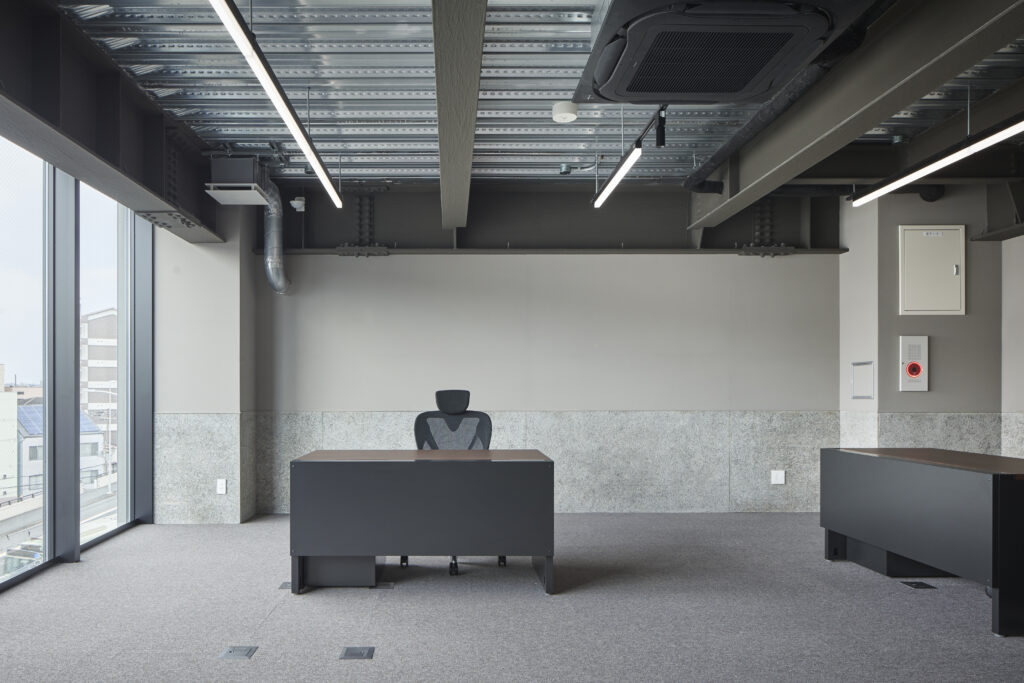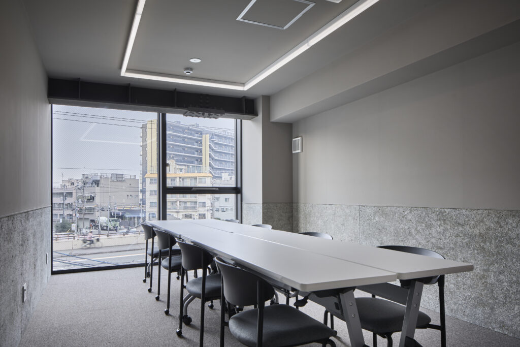 - ミーティングルーム: 落ち着いたグレーを基調とした、清潔感のある会議スペース。